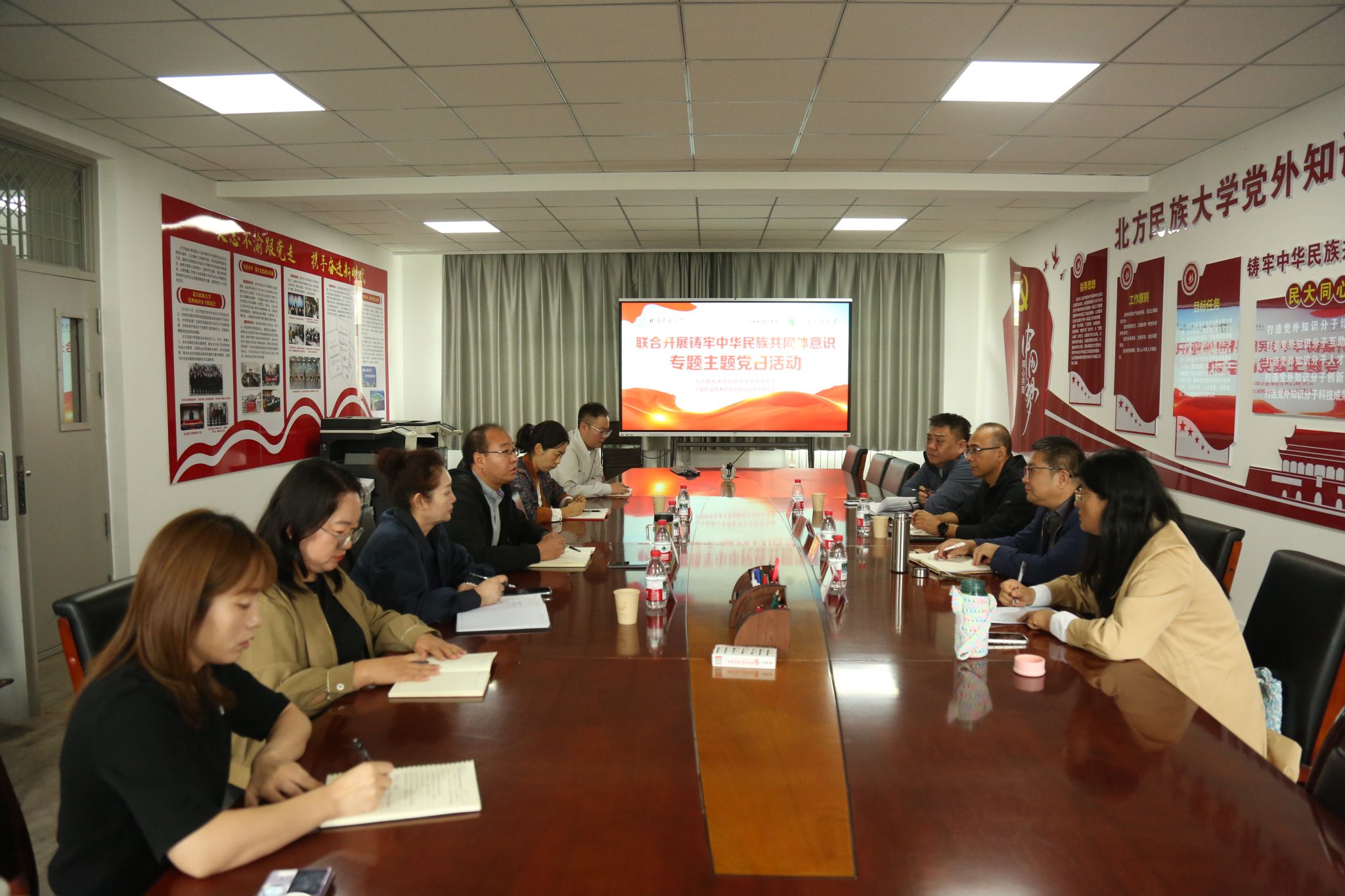 北方民族大学作为国家民委直属高校,在“铸牢中华民族共同体意识”教育方面积累了丰富经验。参观过程中,党员们就如何将民族团结教育融入高校党建和创新创业人才培养展开深入交流,并探讨了未来两校在民族团结教育、创新创业实践等方面的合作可能。